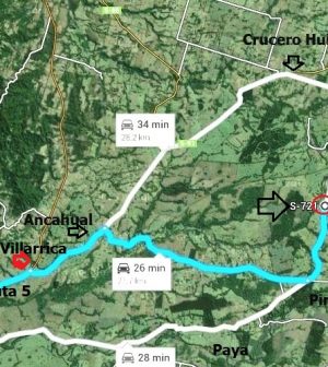 - Desde Ruta 5 por Ancahual: Desde enlace Villarrica por ruta S 91 hacia Villarrica, en cruce Ancahual, hacia la derecha, hasta Pinchafil y luego hacia Casahue: Desde Ancahual, camino ripiado. Esta es la alternativa más corta en kilómetros.