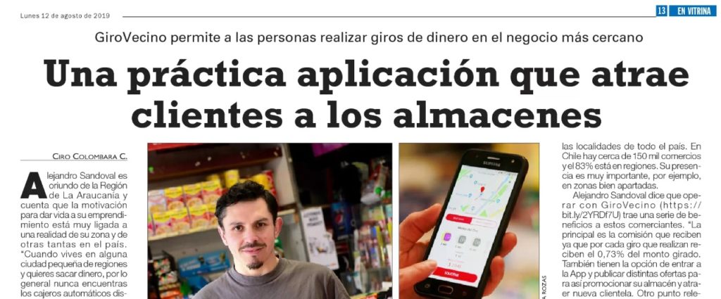 Alejandro Sandoval Ceballos es hijo de Loncoche, Ingeniero Informático, egresado de la UFRO, creador de una aplicación que permite realizar giros de dinero de cualquier negocio cercano, noticia de hoy en la página 13 de El Mayorista de Las últimas Noticias.