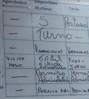 De 6 médicos, uno está de vacaciones, dos con permiso administrativo y uno en turno de urgencia. Solo los doctores, Serrano y Lobos, atendieron 5 pacientes cada uno hoy miércoles. Así lo indica la fotografía de un cartel existente en el hospital que nos enviaron.
