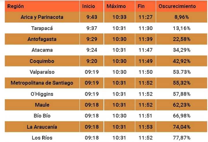El evento astronómico durará alrededor de dos horas y media; para la Región de La Araucanía se indica que se iniciará a las 9,18, su máximo será a las 10,31 y finalizará a las 11,53 horas. El máximo de oscurecimiento del sol será de 74,04 % para nuestra zona.