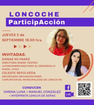Tendremos como invitada principal a Danae Mlynarz, integrante de la Fundación Igualdad, la Red de Participación y actual directora de RIMISP Chile, Centro Latinoamericano para el Desarrollo Rural. Además, nos acompañará Celeste Sepúlveda, encargada de organizaciones comunitarias de la Municipalidad de Loncoche.