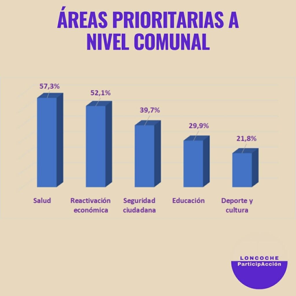 Además, esta encuesta ofreció la posibilidad de referirse a cuáles serían los tópicos del desarrollo comunal más importantes de abordar en los próximos años, donde las personas participantes podían seleccionar hasta 3 alternativas de una serie de opciones, siendo las más votadas Salud (57,3%), Reactivación Económica (52,1%) y Seguridad Ciudadana (39,7%).