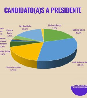 Respecto al ámbito Presidencial, José Antonio Kast ocupó el primer lugar con 32,1%, seguido por Gabriel Boric con 20,5%, luego Yasna Provoste con 17,5%, Sebastián Sichel con 5,6%, Franco Parisi 3,8%, Eduardo Artés 2,1% y Marco Enriquez-Ominami 0,9%. El porcentaje de indecisos fue de 16,2%.