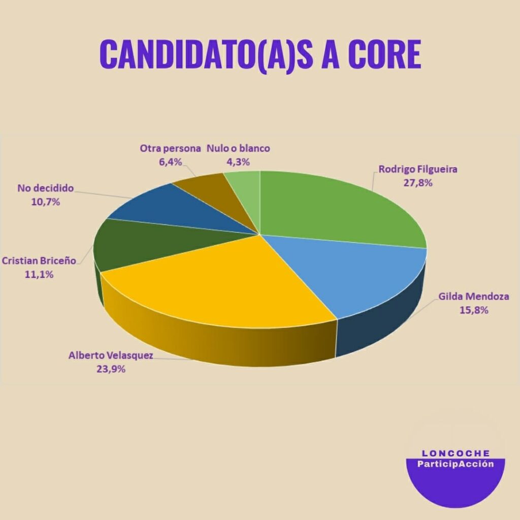 Esta encuesta, que se encontró abierta hasta el día domingo 17 de octubre y donde participaron 234 personas, en relación a los candidatos a CORE oriundos de esta ciudad, arrojó que Rodrigo Filgueira, Independiente en la lista del Partido Radical, lideró las preferencias con un 27,8%; seguido por Alberto Velásquez, Independiente en lista de Evópoli, con 23,9%; luego Gilda Mendoza, de Renovación Nacional y CORE en ejercicio, con 15,8% y finalmente Cristian Briceño, del Partido Comunista, con 11,1%. El porcentaje de indecisos, en tanto, alcanzó el 10,7%.