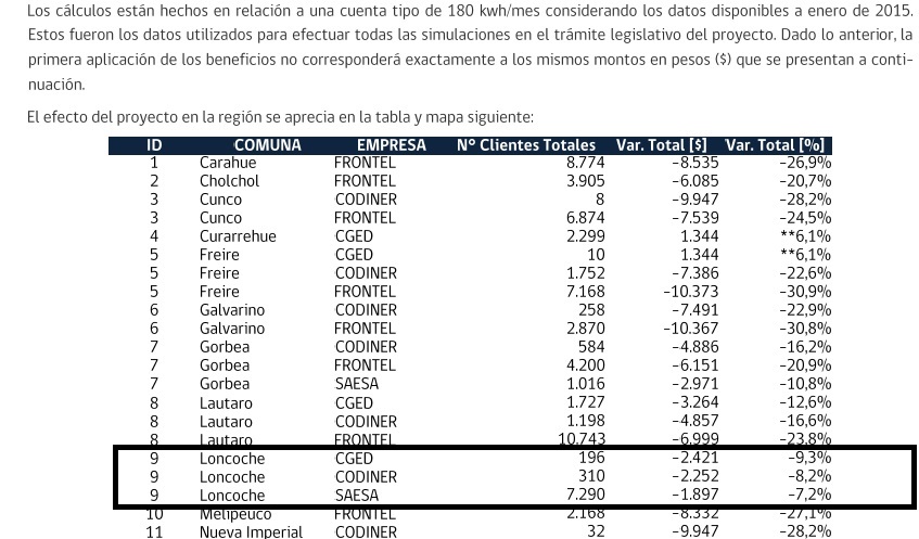 Para los clientes de Saesa, en un 7,2 %, para una cuenta con consumo promedio de 180 kwh/mes, según datos al 15 de Enero de 2015, según cálculo de la Comisión Nacional de Energía. Para otras empresas que operan en la comuna de Loncoche, la baja se indica en la tabla publicada abajo de esta nota.