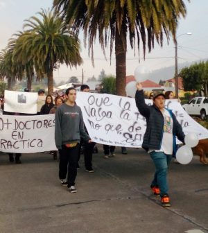 “No más doctores en práctica”, y “Qué la salud valga la pena, no que dé pena la salud!”, decían las pancartas principales que encabezaban la marcha, convocada por las redes sociales, cuyo líder sería Matias Mera, un joven loncochense.