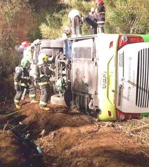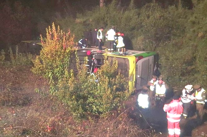 Bus de 2 pisos volcó esta madrugada en la Ruta 5 entre Gorbea y Loncoche