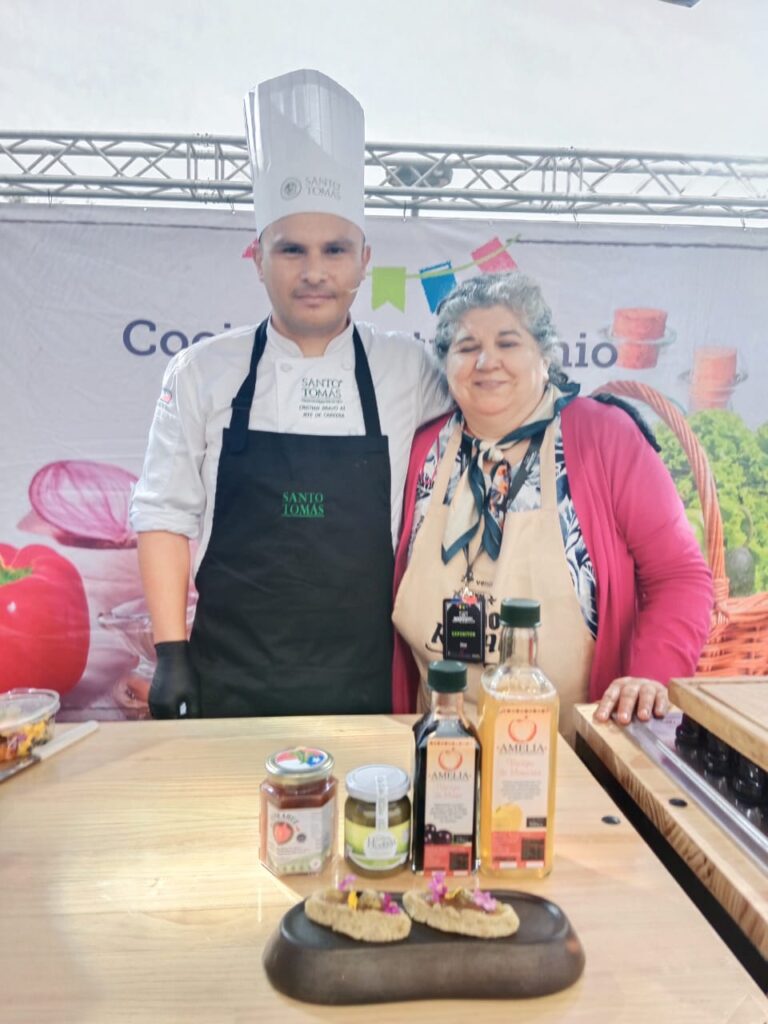 En la tarde de hoy jueves nuestra representante Verónica Cortez, creadora de diversos productos de nuestra flor nacional, el copihue, interactuó en la cocina del escenario central con el Chef Cristian Bravo, jefe de carrera de Gastronomía Internacional y Tradicional Chilena del CFT Santo Tomás.